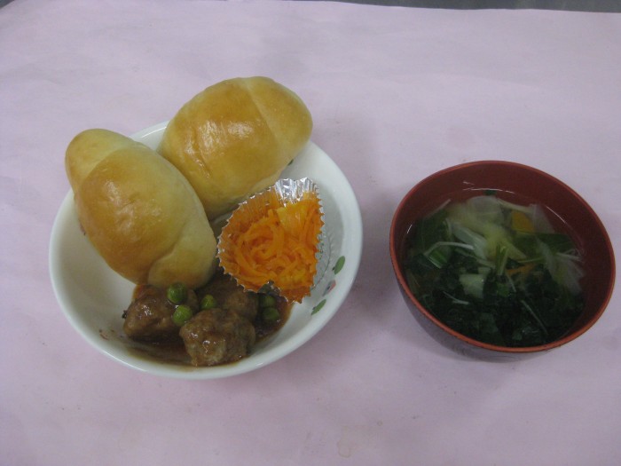| 献立名 | パン ミートボールのケチャップ煮 人参ラぺ コンソメスープ |