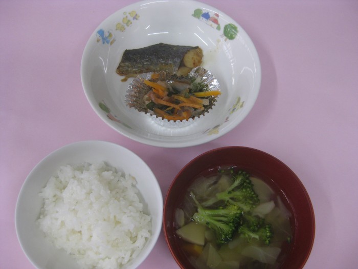 | 献立名 | ごはん さわらのバター醬油焼き 新玉ねぎの梅おかか和え コンソメスープ |