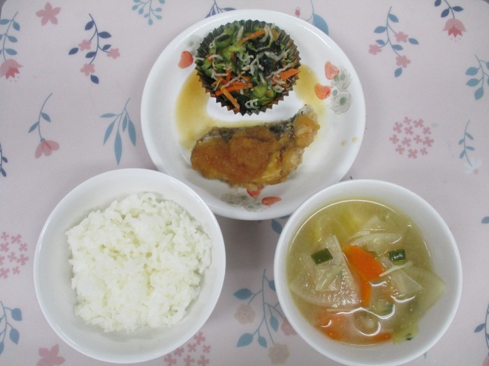 ごはん さばのおろし煮 きゅうりとしらすの酢の物 五目みそ汁 主な材料(赤) 鯖 しらす 厚揚げ みそ 主な材料(黄) 米 片栗粉 油 ごま 主な材料(緑) 生姜 大根 きゅうり 人参 わかめ えのき キャベツ ねぎ 2026/04/14