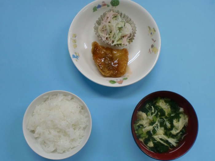 ごはん 白身魚の甘酢和え 春雨サラダ かき玉汁 |