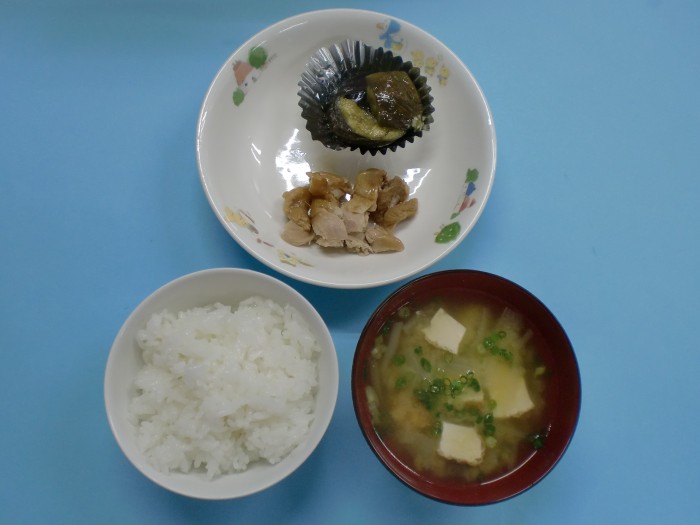 ごはん さっぱり鶏 揚げ茄子 みそ汁 |