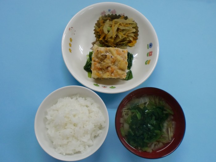 ごはん 高野豆腐とひき肉の煮物 きんぴらごぼう すまし汁 |