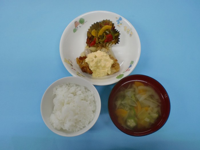 ごはん チキン南蛮 ピーマンのみそ炒め コンソメスープ |