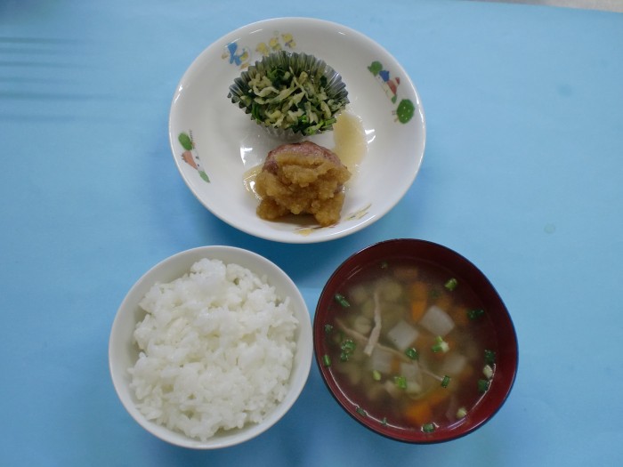 | コメント | 今日はハンバーグ、和え物、スープ、全てに大根を使用しました。ハンバーグはおろし、和え物は切干大根、スープは角切りで形状を変えました。子供たちは全部大根って分かるかな? |