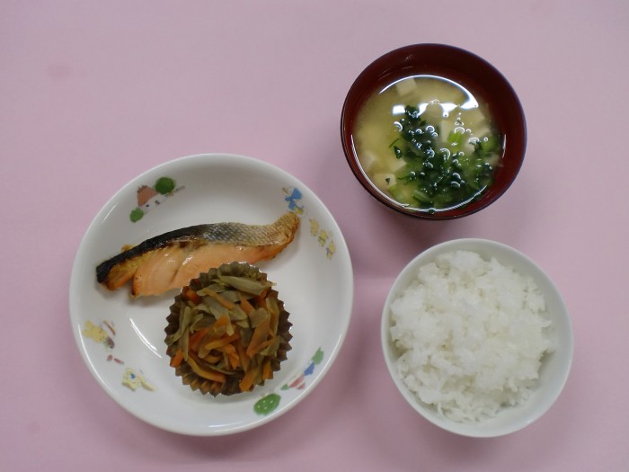 | 献立名 | ごはん 鮭の塩焼き きんぴらごぼう みそ汁 |
