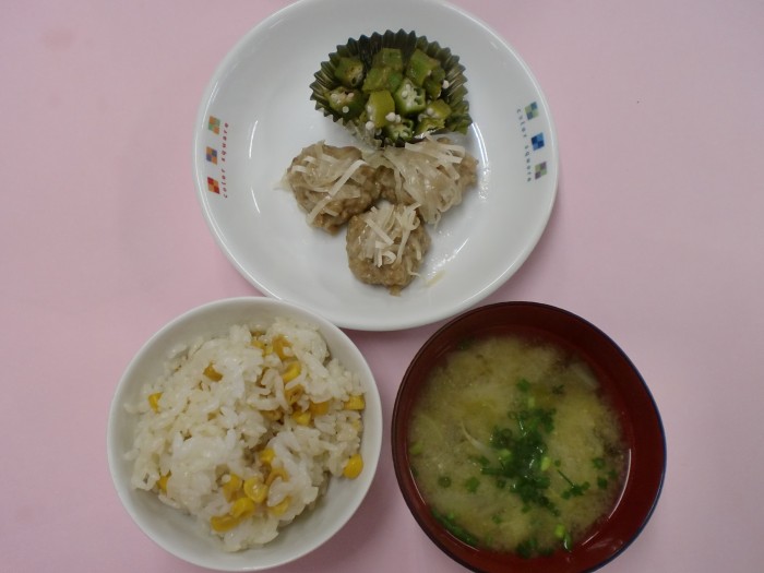 とうもろこしご飯 しゅうまい オクラの梅肉和え みそ汁 |
