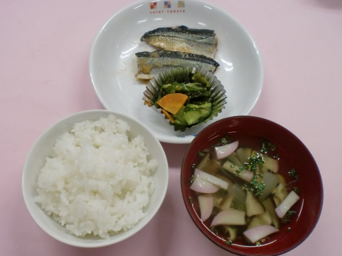 ごはん さんまの蒲焼き 胡瓜とわかめの酢の物 きのこ汁 |