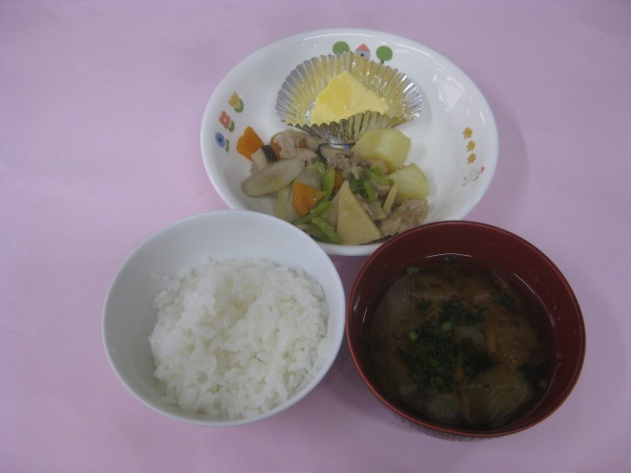 ごはん 春野菜の炒り鶏 たまご豆腐 赤だし汁 |