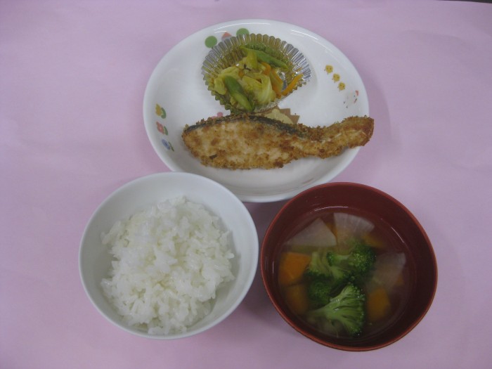 | 献立名 | ごはん さけフライ キャベツのカレーソテー コンソメスープ |