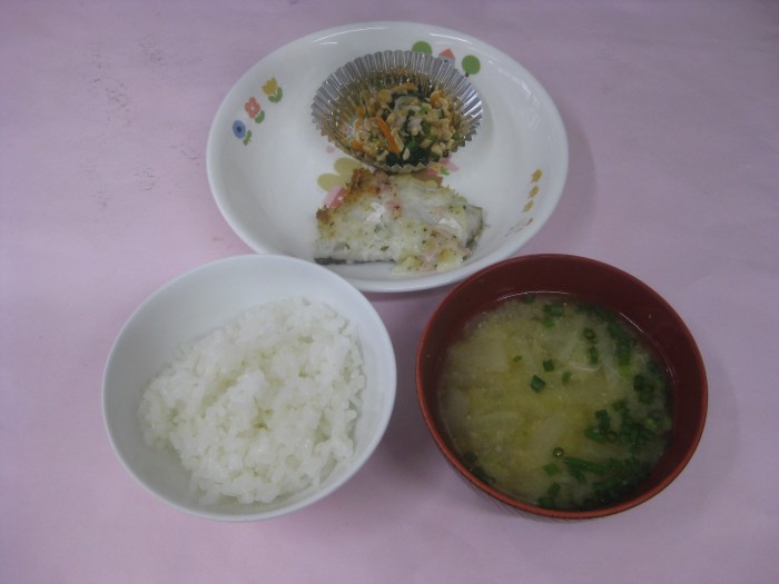 ごはん たらのマヨパン粉焼き 納豆和え さつま汁 |