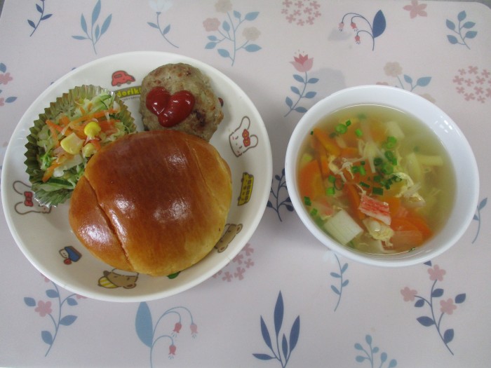 | 献立名 | パン ポテト入りハンバーグ フレンチサラダ 洋風かきたまスープ |