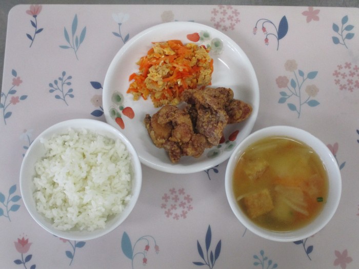 | 献立名 | ごはん 唐揚げ 人参しりしり みそ汁 |