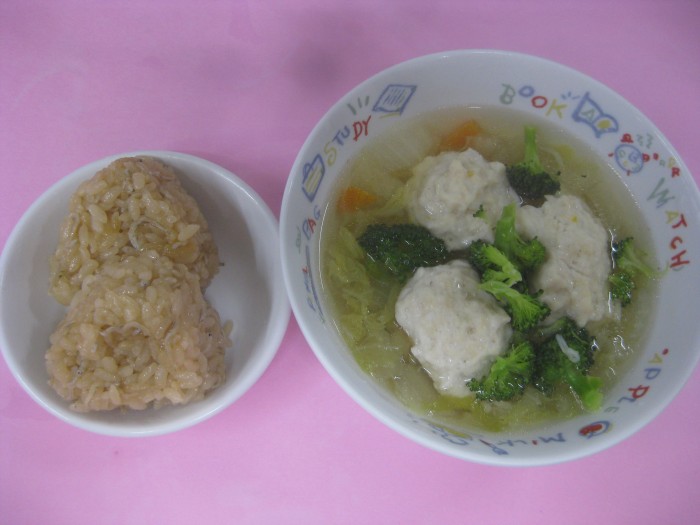 | 献立名 | 生姜とじゃこの炊き込みごはん 鶏だんごのスープ |