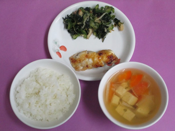 | 献立名 | ごはん 赤魚の西京焼き わかめともやしの酢の物 豆腐のすまし汁 |