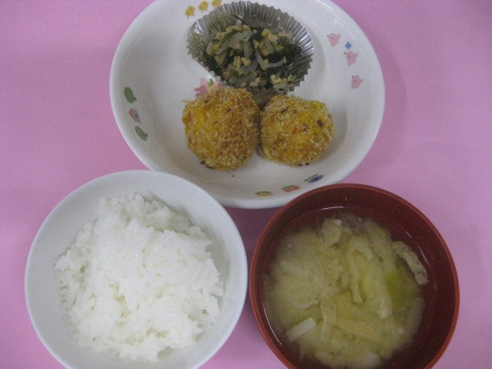 | 献立名 | ごはん 南瓜とさつま芋のコロッケ 納豆和え みそ汁 |