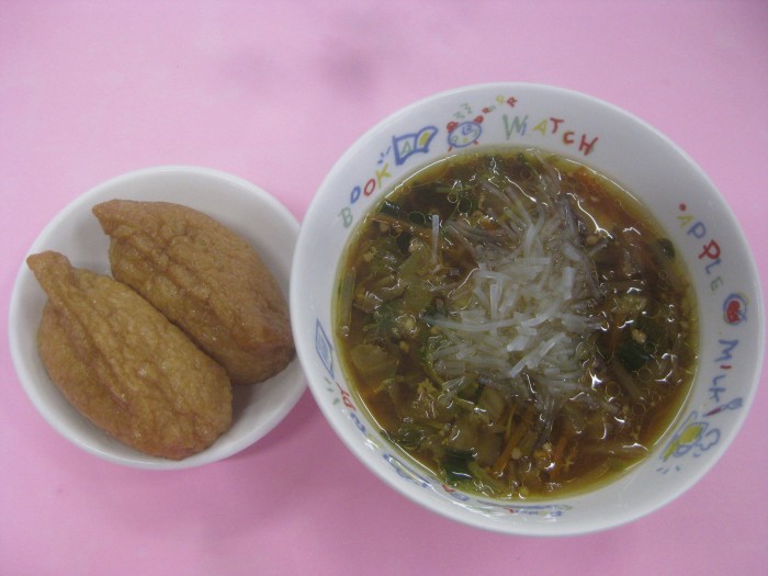 | 献立名 | いなり寿司 豚肉と春雨のみそスープ |
