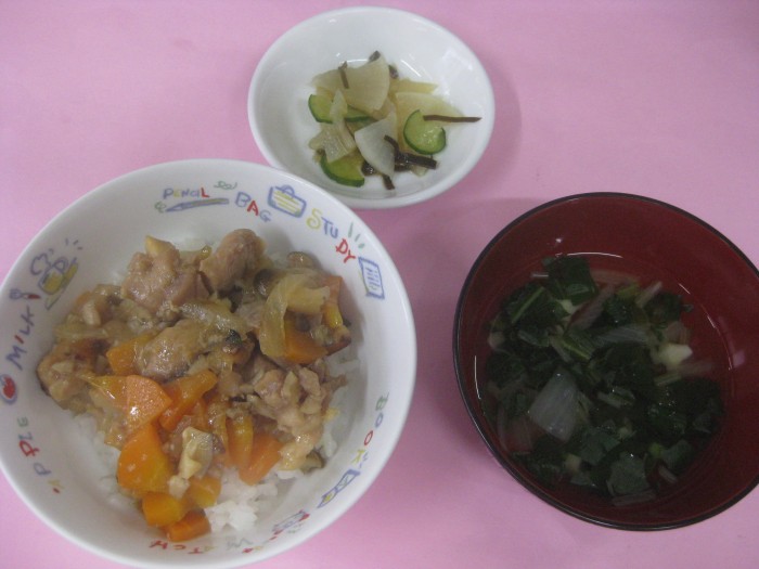 | 献立名 | 焼き鳥丼 大根の塩昆布和え すまし汁 |