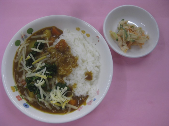 | コメント | 今日のカレーはほうれん草がたっぷり入ったカレーです。トッピングでチーズをのせると、鉄分、カルシウムがたっぷり摂取できます。子どもたちに人気のカレーです。 |