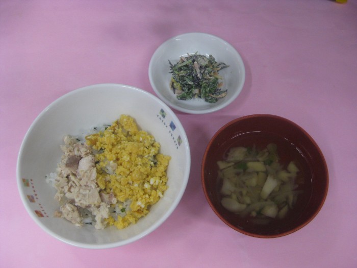 | 献立名 | さけの二色丼 ほうれん草サラダ すまし汁 |