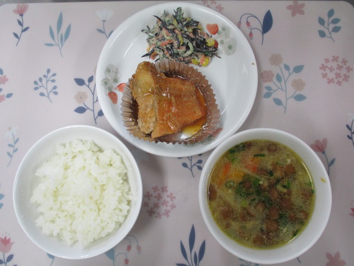 | 献立名 | ごはん 赤魚の煮付け ひじきときゅうりのサラダ 雷汁 |