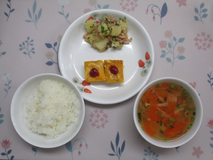 | 献立名 | ごはん チーズオムレツ ジャーマンポテト 洋風マカロニスープ |