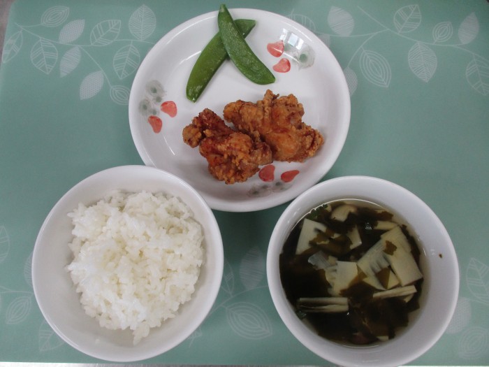 | 献立名 | ごはん 鶏肉の唐揚げ スナップエンドウ 筍のすまし汁 |