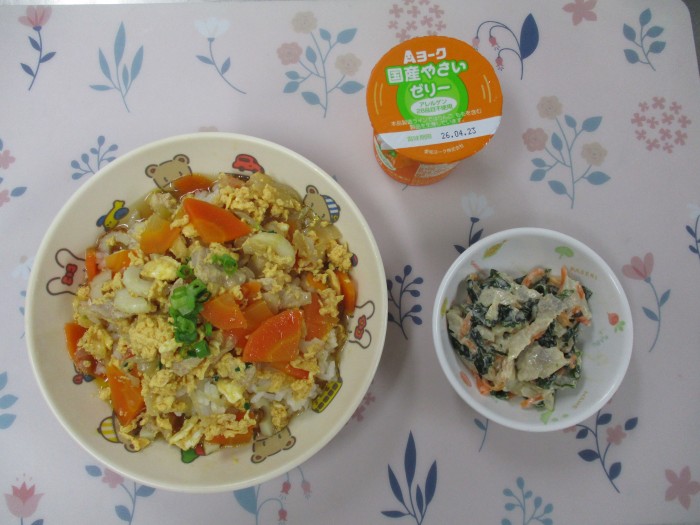 | 献立名 | 親子丼 れんこんとわかめのサラダ ゼリー |