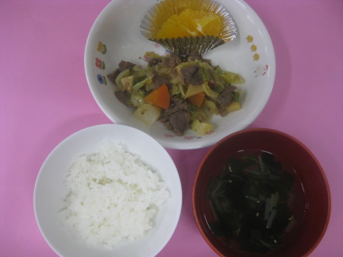 ごはん 筍と牛肉のオイスター炒め わかめスープ オレンジ 献立表 主な材料(赤) ぎゅうにく わかめ 主な材料(黄) こめ ごま 主な材料(緑) たまねぎ にんじん キャベツ もやし みずな たけのこ ピーマン オレンジ エネルギー量 323kcal たんぱく質 13.1g → 続きを読む 2026/04/08