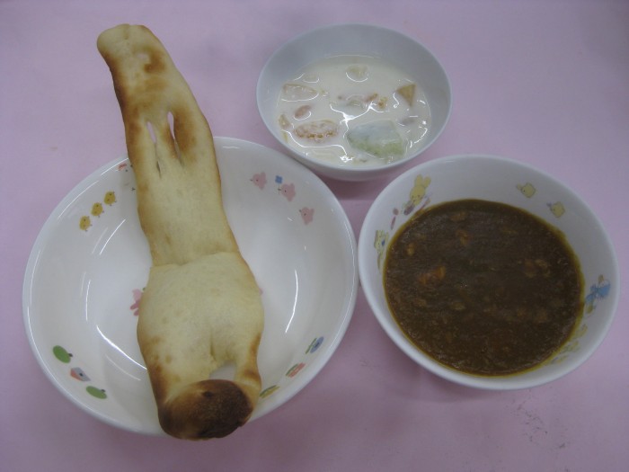 三歳以上児はカレーと一緒に食べるナンづくりに挑戦しました。今日がハロウィンということもあり、おばけの形をしたナンを作りました。素敵なおばけがたくさんできあがりましたよ! |