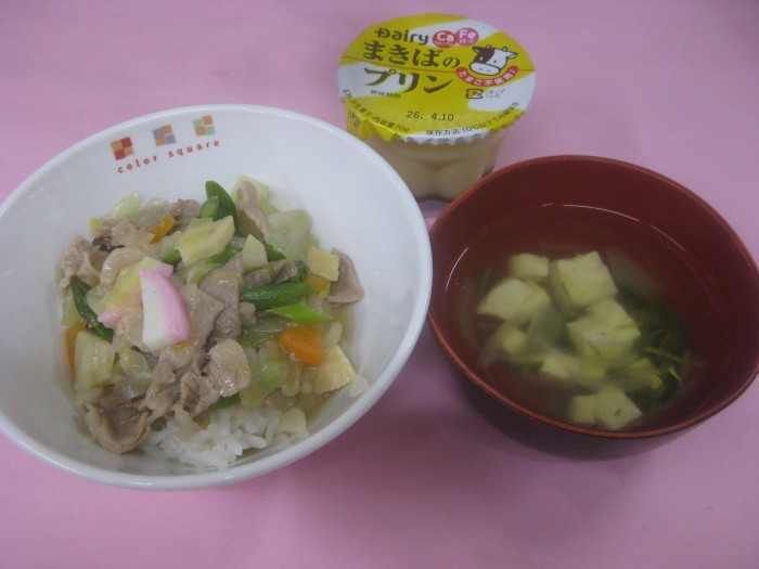 献立名 春野菜の中華丼 豆腐のとろみスープ プリン