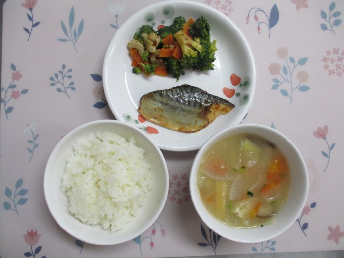 | 献立名 | ごはん 鯖の塩焼き ブロッコリーのおかか和え 具沢山みそ汁 |