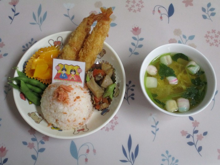 鮭ごはん エビフライ 筑前煮 枝豆 桃 お麩入りかきたま汁 |